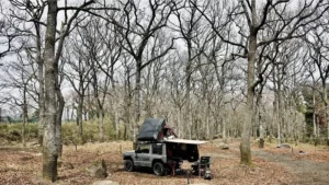 ルーフテント: まずは寝床の確保。ルーフテントを載せれば、ジムニーはどこでも秘密基地になります。
