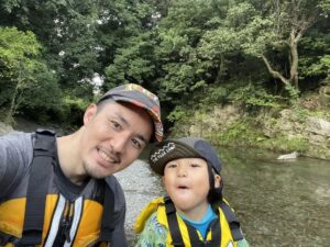 穏やかな清流に子どもと浮かぶ